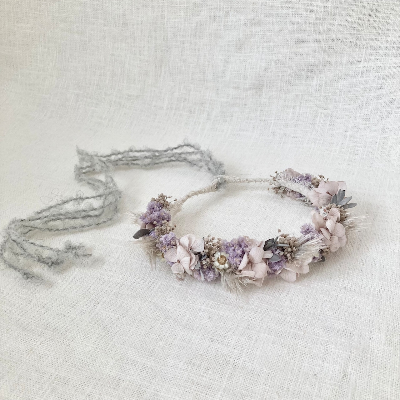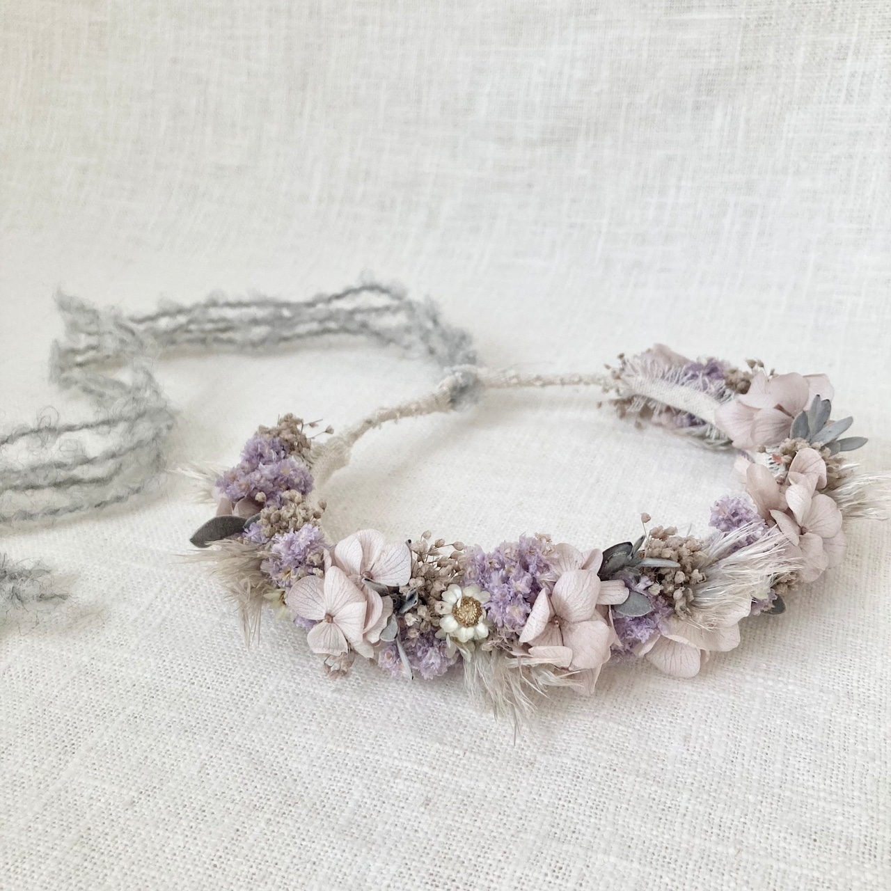 ♢material :プリザーブドフラワー(アジサイ、カスミソウ、ブベッセンス、プルームリード)ドライフラワー(スターフラワー、クリスパム)ワイヤー、フローラテープ、コットンリボン、ウールリボン